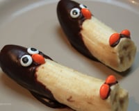 Disposer les bananes recouvertes de chocolat dans une assiette. Ajoutez les Smarties et les yeux en pâte à sucre avant que le chocolat ne fige. Placez les pingouins.