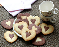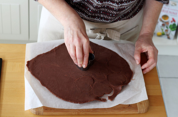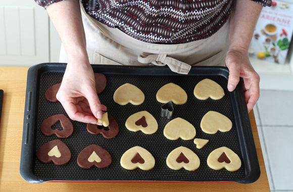 Posez les coeurs nature et cacao sur une plaque de cuisson et laissez reposer au frais pendant 15 minutes. Evidez chaque coeur avec un petit emporte pièce. Récupez les petits coeurs nature et mettez-les dans les coeurs au cacao et inverssement.