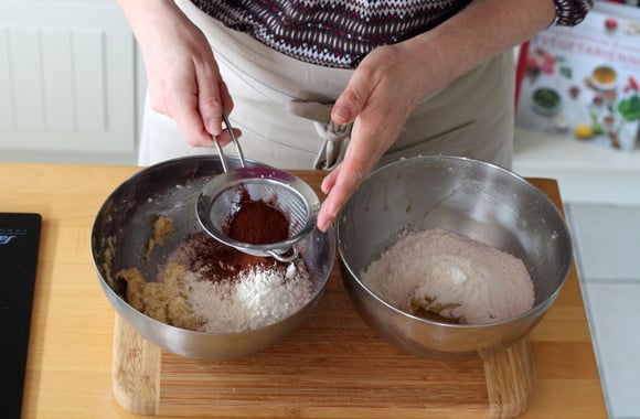 Séparez le mélange en deux (150g dans chaque bol environ). Dans le premier bol, ajoutez la moitié de la farine. Dans le second, ajoutez le reste de la farine et le cacao tamisé.