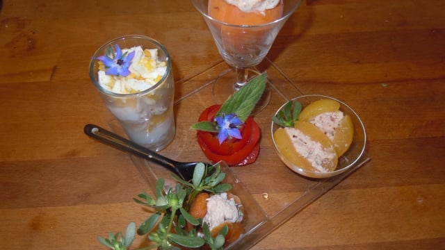 Dans une verrine mettre le reste de thon, une couche d'oeuf dur coupée en petits morceau, une c à s de yaourt nature recommencez jusqu'au bord en terminant par les oeufs durs, ajoutez une cuillère à soupe de confiture maison à la fructose et posez une fleur de bourache ou de primevère - 6