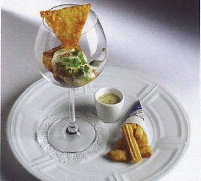 - 1Portionner des morceaux de bar de 100g et faire 3 goujonettes de 10g.Cuire 2 gousses d'ail au lait, mixer et réserver. Monter 4cl de crème fraîche et incorporer la crème d'ail, saler et poivrer.Faire des arlettes en feuilletage avec le fromage d'Idiziabal râpé et les détailler en triangle.