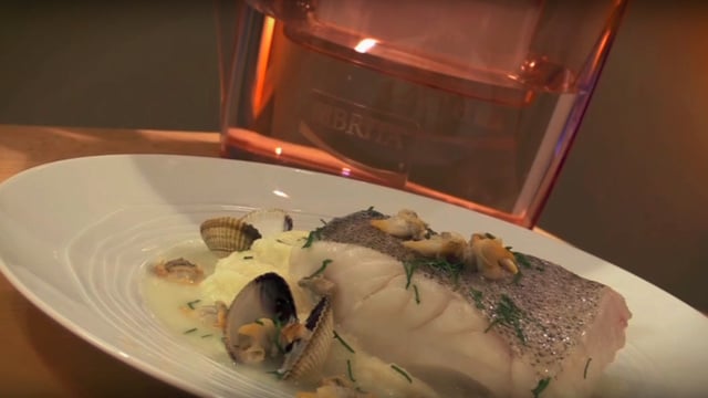Stoppez la cuisson du chou-fleur et mixez dans un robot. Retirez les coques du feu. Déposez le bouillon d'algue dans une poêle, ajoutez un peu de jus de coques, ajoutez le poisson et faites cuire à frémissement 4 à 5 minutes.