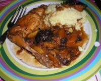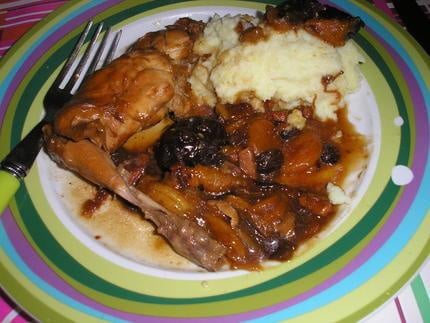 Du lièvre mijoté à la bière, avec des oignons, des échalotes, des raisins sec et des pruneaux.