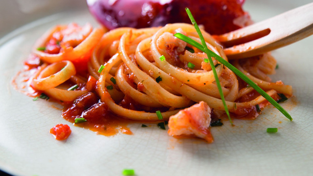 Prenez une grande poêle, faire revenir les morceaux de homard avec une cuillère d'huile d'olive à feu vif et ajoutez la sauce au jus de crustacés.
