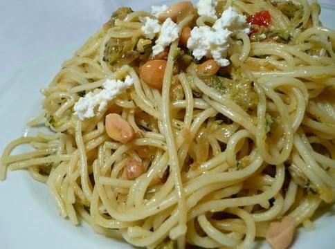 Quand c'est cuit, rajoutez les pâtes, le parmesan et les cacahuètes. Arrosez du jus de citron. Mélangez bien.
