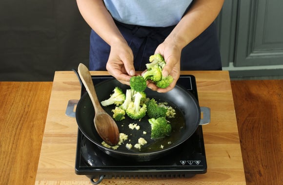 Hachez les gousses d'ail puis faites-les revenir dans de l'huile d'olive. Ajoutez le brocolis, salez, poivrez et laissez rôtir 2 minutes.