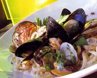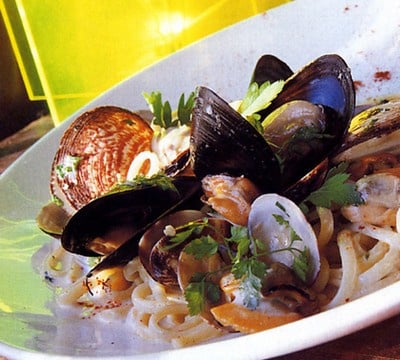 Verser aussitôt la préparation aux coquillages sur les pâtes égouttées.