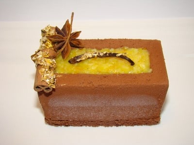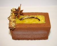 La mousse cannelleFaites tremper les feuilles de gélatine dans un bol d'eau froide. Portez le lait à ébullition avec les bâtons de cannelle, puis laissez infuser à couvert pendant 30mn. Mélangez au fouet dans un saladier les jaunes avec la cassonade, puis versez dessus le lait infusé et passé au chinois. Faites cuire la crème jusqu'à épaississement mais sans ébullition. Ajoutez la gélatine ramollie et essorée, puis laissez refroidir. Montez la crème en chantilly, et incorporez-la dans la crème froide. Reprenez vos mousses chocolat congelées, puis déposez sur chacune un insert caramel orange congelé, et coulez la mousse cannelle jusqu'aux ¾ de hauteur. Congelez à nouveau pendant au moins 2 heures, puis découpez 6 rectangles de financiers de la même dimension que vous posez pour finir sur les mousses cannelle congelées. Bloquez à nouveau au congélateur.DressageDémoulez les bûches, puis bombez-les de spray velours. Remplissez la cavité avec la compotée d'orange à la vanille, lissez bien le dessus, décorez avec un morceau de gousse de vanille passée dans le feuille d'or, puis posez sur le côté un bâton de cannelle recouvert de feuille d'or, et une étoile de badiane. Laissez revenir à température ambiante pendant 1 heure.