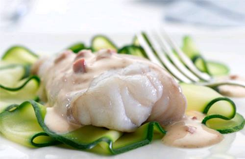 Faites cuire les lamelles de courgette dans de l'eau chaude pendant une minute, égouttez puis disposez-les sur 2 assiettes. Versez la lotte et la sauce curry par-dessus.