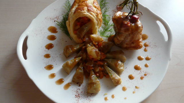 Recette de Fête, très bon mariage lotte et chorizo. La sauce relève bien le plat.