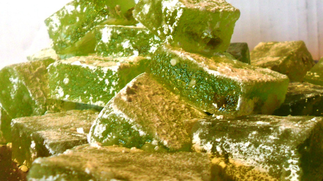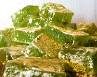 Dans une casserole, faire chauffer le sirop et l'agar-agar à feux très doux. Ne pas porter à ébullition mais laisser chauffer tout doucement. Si vous souhaitez avoir des loukoums de couleur, mettre un peu de colorant alimentaire (vert).