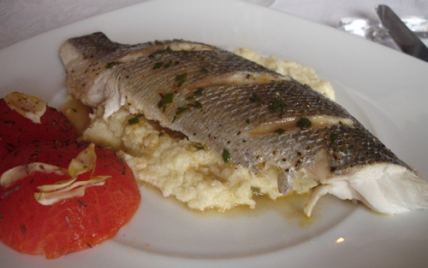 Loup farci passé au four, avec farce à base de mie de pain et de filets de poisson.