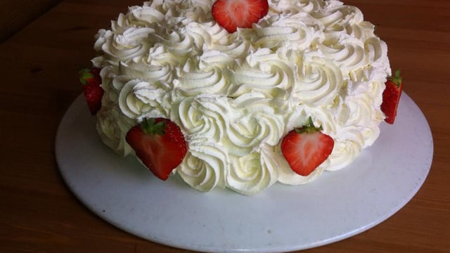 Couper la génoise en 2 y ajouter un peu de crème et quelques fraises en tranches.
