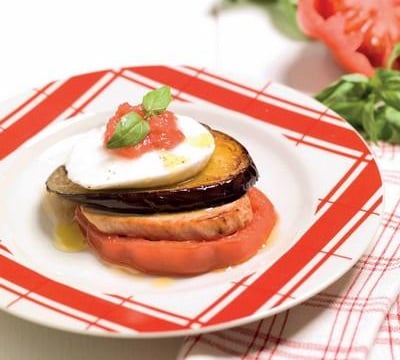 de tomate, une escalope de veau, une tranche d'aubergine, une tranche de mozzarella et terminer avec une tranche de tomate. Saler, poivrer, saupoudrer de basilic ciselé et napper d'un filet d'huile d'olive.