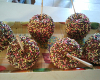 - Insérez une pique en bois dans chaque pomme et plongez-les une à une dans le caramel en les enrobant bien.