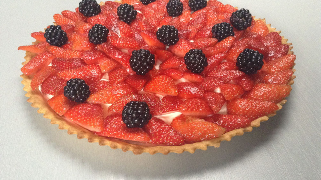 Garnissez maintenant la crème avec la poche à douille sur la pâte cuite, disposez les morceaux de fraises harmonieusement sur la tarte et garnissez de mûres. Bon appétit !