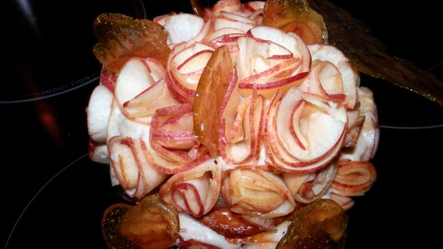 Feuillantine sucrée à la cannelle vanille montée de compote et de crème a la pomme granny smith. Bouquet de roses de pommes.