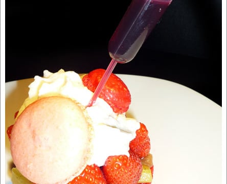 Une base de macaron version dessert individuel, recouvert d'un lit de rhubarbe juste pochée à la vanille, quelques fraises entières et une chantilly au mascarpone. Pour une touche originale et un peu acidulée, je l'ai servi avec une pipette de sirop d'hibiscus.
