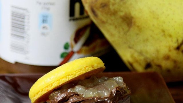 Etalez une fine couche de pâte à tartiner sur l'une des coques et une fine couche de confiture de poire sur l'autre coque, puis réunissez les deux coques en tournant légèrement sur elles-mêmes afin de bien répartir la garniture. L'association de ces deux saveurs est un vrai régal que je vous conseille, d'autant que la garniture est d'une simplicité enfantine à réaliser.