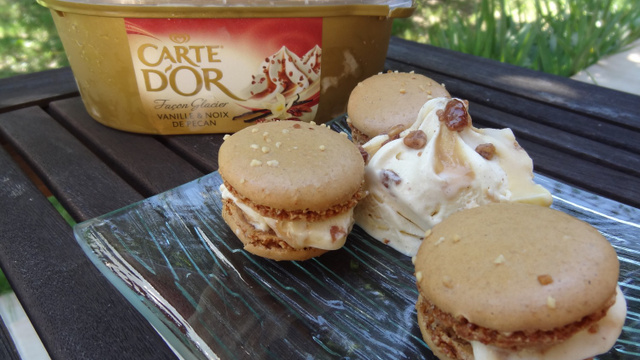 Au moment de servir, assemblez les coques de macarons deux par deux avec une cuillère de Crème glacée Carte d'Or® Façon Glacier Vanille et Noix de Pécan.