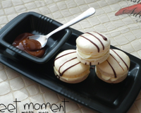 Déposez la plaque contenant les macarons sur une autre plaque vide et enfournez à 120° pendant 23 minutes. Sortez les coques du four et laissez-les refroidir. Pendant ce temps, faites fondre le chocolat noir au bain marie puis versez-le dans un cornet à décorer (ou une seringue à décorer). Zébrez les coques en passant rapidement au-dessus et en déposant un filet de chocolat. Laissez durcir le chocolat avant de décoller les coques (le mieux est de placez le tout au réfrigérateur pendant quelques minutes.