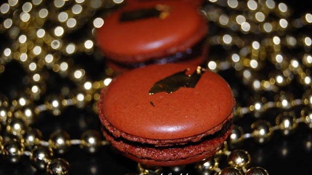 Recette de macarons festifs aux saveurs de Noël, mélange de ganache au chocolat aux écorces d'oranges confites, une très belle associations .