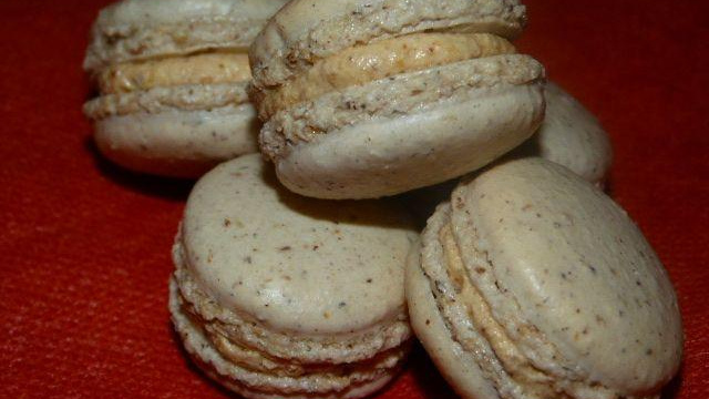 Macarons à la meringue italienne fourrés avec une crème au beurre au praliné de Pierre Hermé.