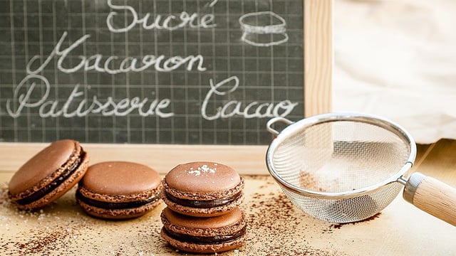 Dès que le sirop à 117°c, laisser le sirop débuller et le verser en filet dans les blancs sans cesser de fouetter. Laisser la meringue refroidir toujours en fouettant. Mélanger ensuite les 90g de blancs d'oeufs crus restant en 3 fois à l'aide d'une spatule au mélange sucre glace/poudre d'amande/cacao jusqu'à l'obtention d'une texture pâte d'amande. Incorporer la meringue en 3 fois au mélange précédent puis macaronner (c'est à dire, mélanger énergiquement en soulevant la pâte avec une spatule) jusqu'à ce que ça fasse un ruban. Garnir une une poche à douille lisse de 8mm et sur une plaque allant au four recouverte de papier sulfurisé, pocher les macarons en les espaçants suffisamment pour ne pas qu'ils se touchent à la cuisson. Préchauffer le four à 140°c et enfourner pendant 16 minutes.