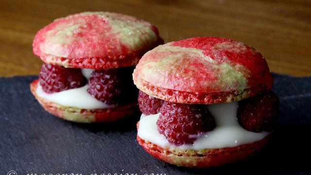 J'aime beaucoup ces macarons, pour le côté raffiné qu'apportent les framboises entières à la décoration. Par contre, j'aurais tendance à vous conseiller de les servir en version « dessert », dans une assiette... car ils se tiennent un peu moins bien que d'autres macarons plus simples.Vous pouvez également dans ce cas, prévoir de faire vos coques d'un diamètre pas trop petit, de manière à pouvoir les garnir plus généreusement. Et comme moi, vous pouvez vous amuser à mélanger les couleurs ! Le truc est simple : il suffit de préparer un peu de tant pour tant de chaque couleur (rose framboise et vert pistache), et de les mettre dans la poche à douille en les alternant. Vous aurez ainsi de belles volutes bicolores pour vos coques.Vous pouvez également dans ce cas, prévoir de faire vos coques d'un diamètre pas trop petit, de manière à pouvoir les garnir plus généreusement. Et comme moi, vous pouvez vous amuser à mélanger les couleurs ! Le truc est simple : il suffit de préparer un peu de tant pour tant de chaque couleur (rose framboise et vert pistache), et de les mettre dans la poche à douille en les alternant. Vous aurez ainsi de belles volutes bicolores pour vos coques.
