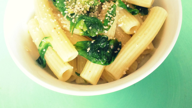 Plonger les pâtes dans un grand volume d'eau salée bouillante. Une fois qu'elles sont cuites, bien les égoutter et bien les mélanger aux têtes de choux. Parsemer de chapelure et servir immédiatement.