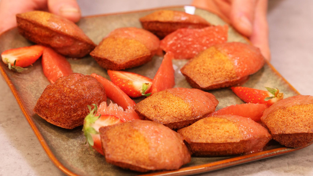 A la sortie du four des madeleines, encore tièdes, trempez les dans le glaçage pour ne conserver qu’une fine pellicule.