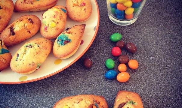 Répartir la pâte dans les alvéoles d'un moule à madeleines, et saupoudrer les d'un peu de M&M's.