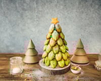 Recouvrez le cône en polystyrène de papier cuisson. A l'aide de cure-dents inclinés vers le haut, plantez les madeleines tout autour du cône en disposant les madeleines le plus foncées vers le bas.