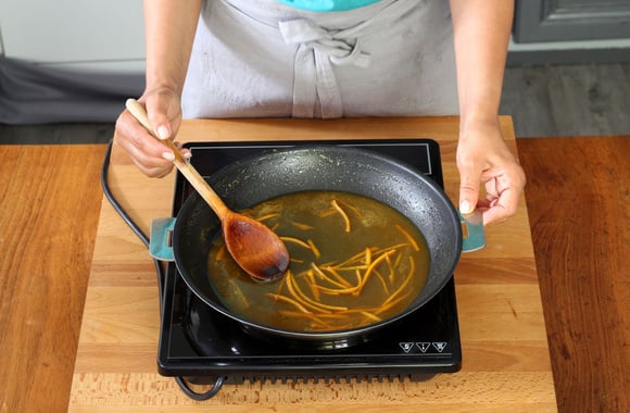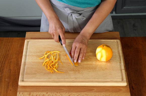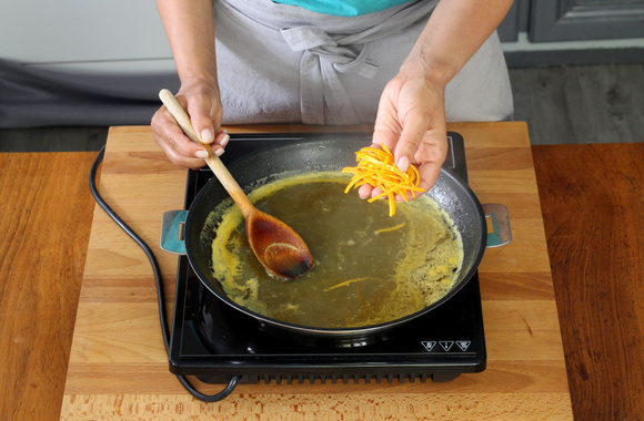 3Lavez l’orange, prélevez le zeste et coupez-le en fines lanières.