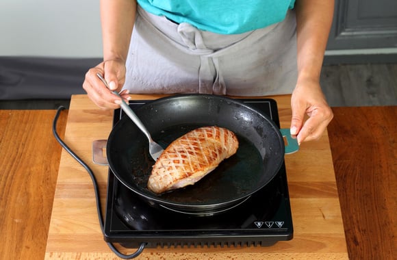 4Chauffez la poêle à feu moyen, déposez le magret côté peau en dessous. Laissez fondre la graisse environ 5 minutes jusqu’à ce que la peau soit bien dorée, baissez le feu au besoin. Retirez l’excès de graisse fondue au fur et à mesure et mettez-la de côté. Retournez le magret côté chair et poursuivez la cuisson à feu moyen 5 à 7 minutes. Salez, poivrez puis recouvrez le magret de papier aluminium et laissez-le reposer 5 minutes.