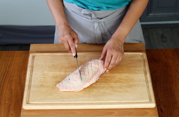 2Enlevez l'excédent de gras autour du magret, puis incisez-le côté peau en croisillon ou en carré.
