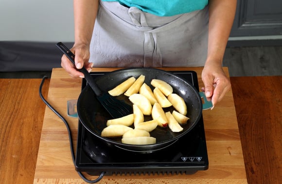 5Avec le gras qui reste dans la poêle, faites sautez les morceaux de pommes pendant 6 minutes.