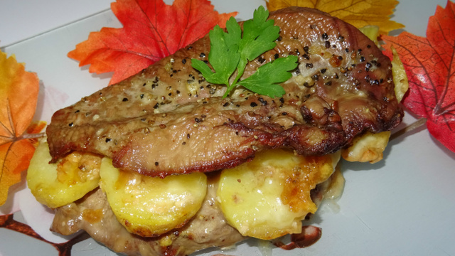 Tartiner chaque morceau de viande avec un peu de moutarde. Couper les pommes de terre (déjà cuites) en rondelles, puis les disposer sur un morceau de magret.