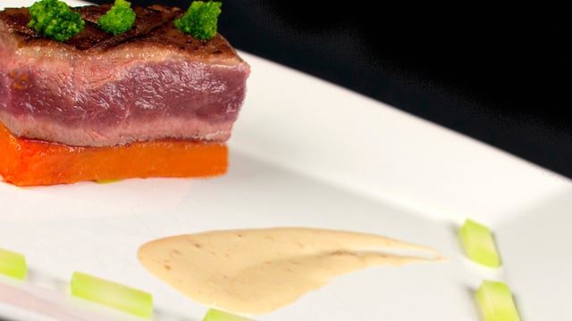 Couper les magrets à la taille des pavés de potiron et les dresser sur l'assiette.