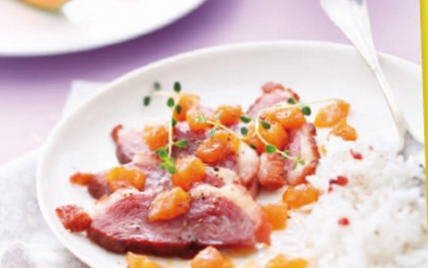 Trancher finement les magrets et les répartir avec le melon caramélisé sur chaque assiette.