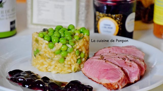 20 min avant la fin de la cuisson du magret, préparer le risotto : Peler et émincer l'oignon. Dans une casserole, faire revenir l'oignon émincé dans l'huile et remuer pendant 1min. Ajouter le riz et mélanger pendant 2 min. Ajouter une louche de bouillon et remuer de temps en temps jusqu'à ce que le riz absorbe le bouillon. Répéter l'opération jusqu'à ce que le riz soit cuit (vérifier la cuisson en goûtant!). Ajouter le gingembre et le chili tex mex. A la fin, ajouter les petits pois cuits et mélanger.