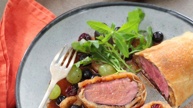 Servir aussitôt avec les fruits, le jus déglacé et une salade de mesclun.