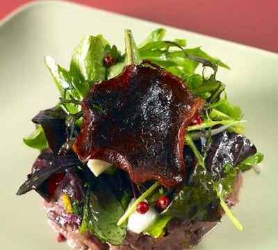 - 3Dressez le tartare, surmontez-le de roquette, croûtons de peau de canard, baies roses et de la tranche de bacon.Servez aussitôt.
