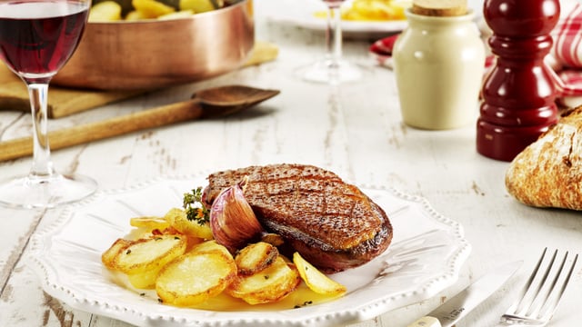 Enduire les magrets de canards avec le reste de la graisse d'oie et relaisser 10 mn de cuisson, saler et poivrer. Une fois la cuisson finie, disposer les magrets cuits sur un lit de pommes de terre.