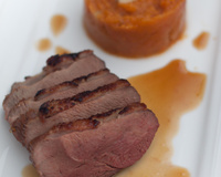 Magrets de canard gras dans une marinade aigre-douce. Marinade réduite pour en faire une sauce. Le tout accompagné d'un écrasé de patate douce et butternut relevé par un beurre aromatisé au gingembre.