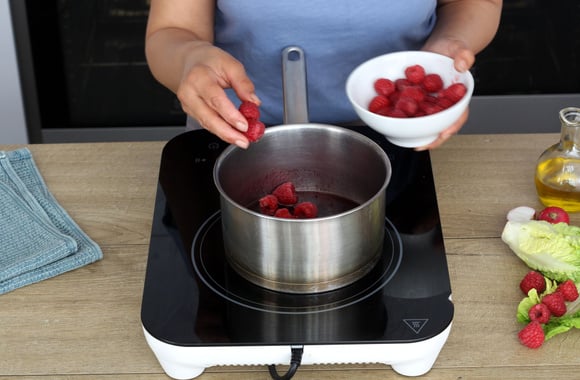 7Récupérez les sucs des cuisson des Magrets de Canard sur la plancha et versez-les dans une petite casserole. Ajoutez-y le reste de la marinade au vinaigre de framboises. Ajoutez les framboises fraîches et laissez réduire le tout à feu doux.