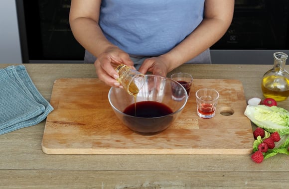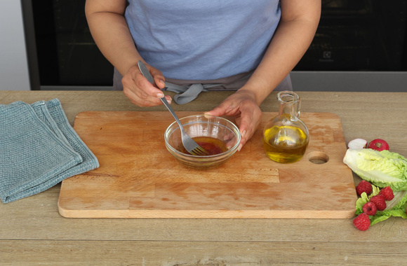 Dans un bol, commencez par la vinaigrette en mélangeant le vinaigre de framboises, l'huile d'olive le sel et le poivre.