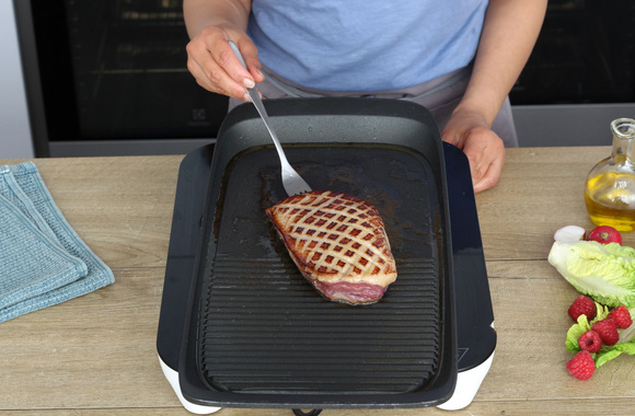 6Chauffez une plancha à feu moyen et déposez les Magrets de Canard côté peau en dessous. Laissez fondre la graisse environ 5 minutes jusqu’à ce que la peau soit bien dorée, baissez le feu au besoin. Retirez l’excès de graisse au fur et à mesure pour ne pas frire la viande. Retournez les Magrets de Canard côté chair et faites-les cuire à feu moyen 5 à 7 minutes.