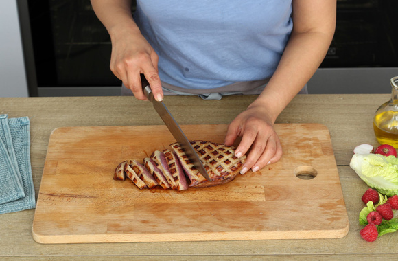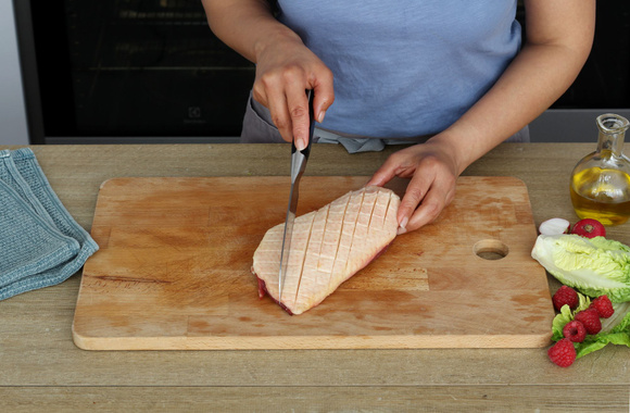 4Enlevez l'excédent de gras autour des Magrets de Canard. Puis incisez-les côté peau en croisillons ou en carrés.