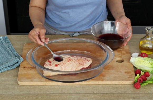 5Enduisez-le généreusement du mélange vinaigre de framboises et gardez l'excédent de la marinade de côté.